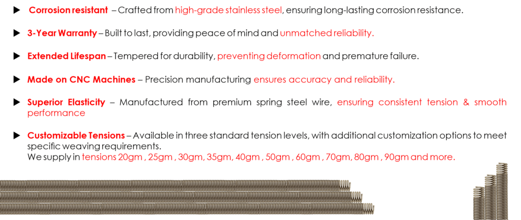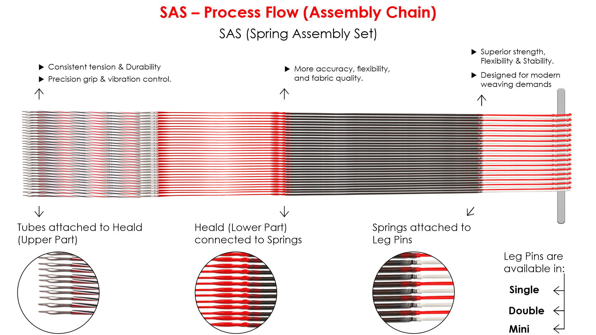 AAS Springs are essential for the spring assembly set, attaching to the bottom part of the heald to provide the necessary tension and flexibility for smooth yarn movement. Unlike traditional springs, AAS Springs are designed for long-lasting elasticity, rust resistance, and consistent performance.